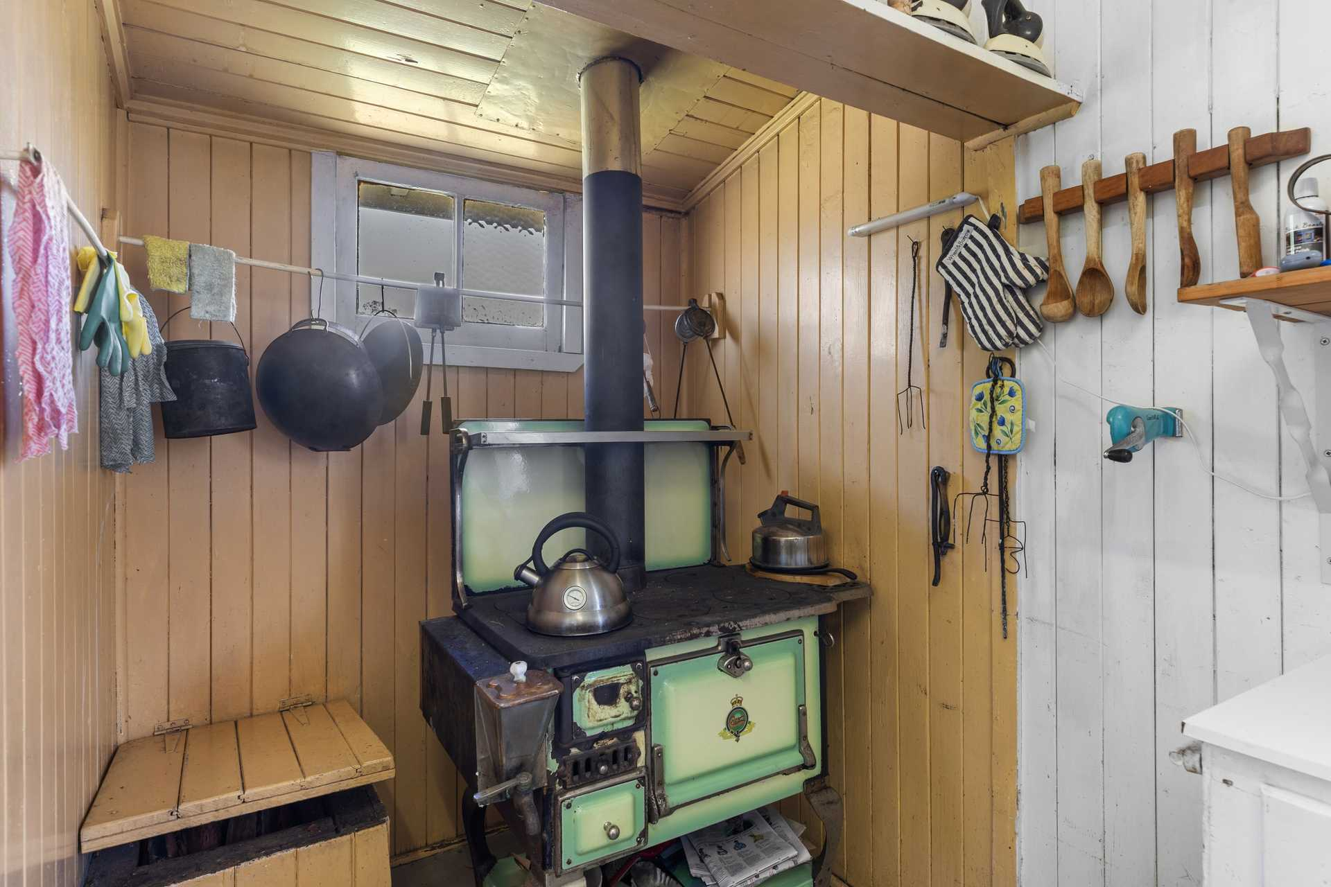 Inside, the home features a country-style kitchen with a beautiful wood combustion stove alongside a modern upright gas oven and a large walk-in pantry.