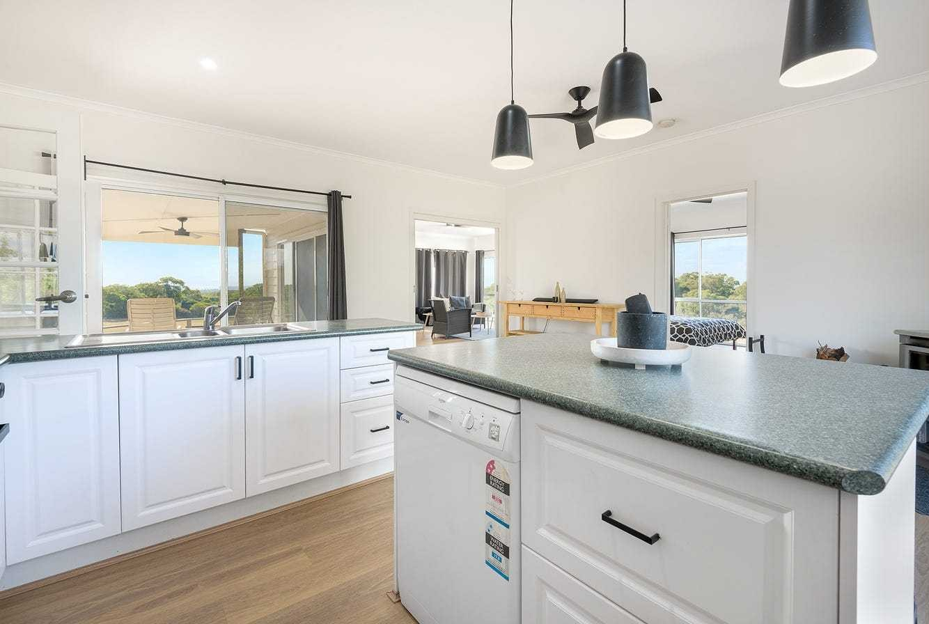 The elevated, light-filled home sits at approximately 45m above sea level and enjoys sweeping views across open paddocks, native bushland and toward the mainland.