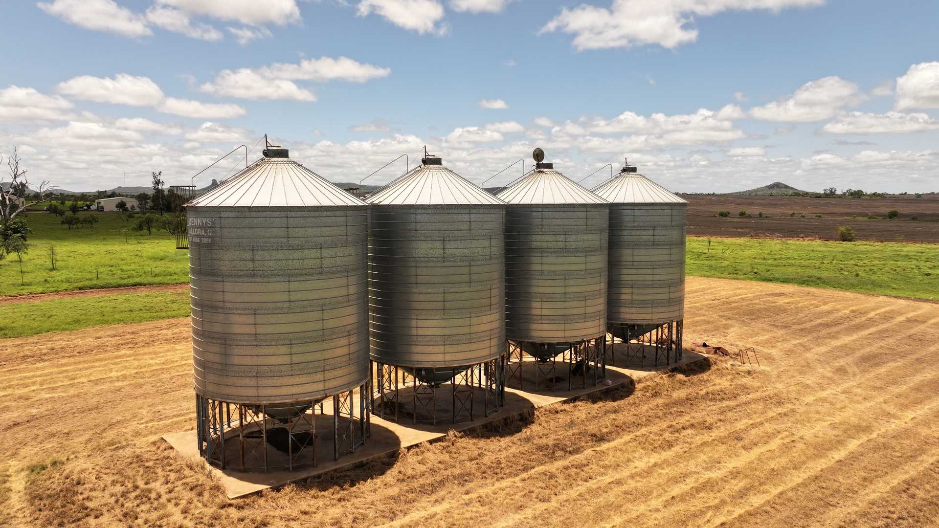 This mixed farm for sale QLD includes multiple machinery and storage sheds, four silos and large cattle yards