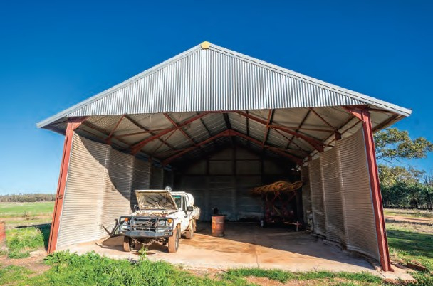 There are also extensive machinery and grain storage sheds, including a new drive-through machinery shed spanning 27m x 18m x 7m, two grain sheds, two hay sheds, and additional outbuildings, all in excellent condition. There are also eight silos offering 280 tonnes of storage.