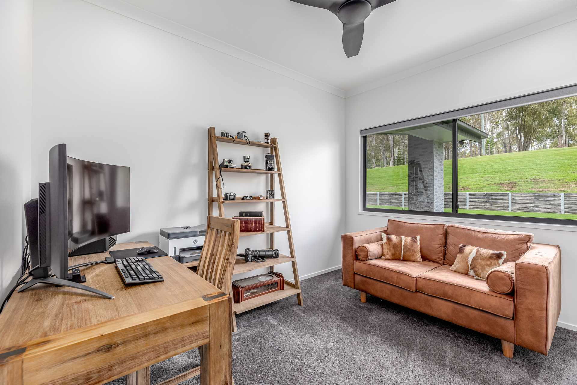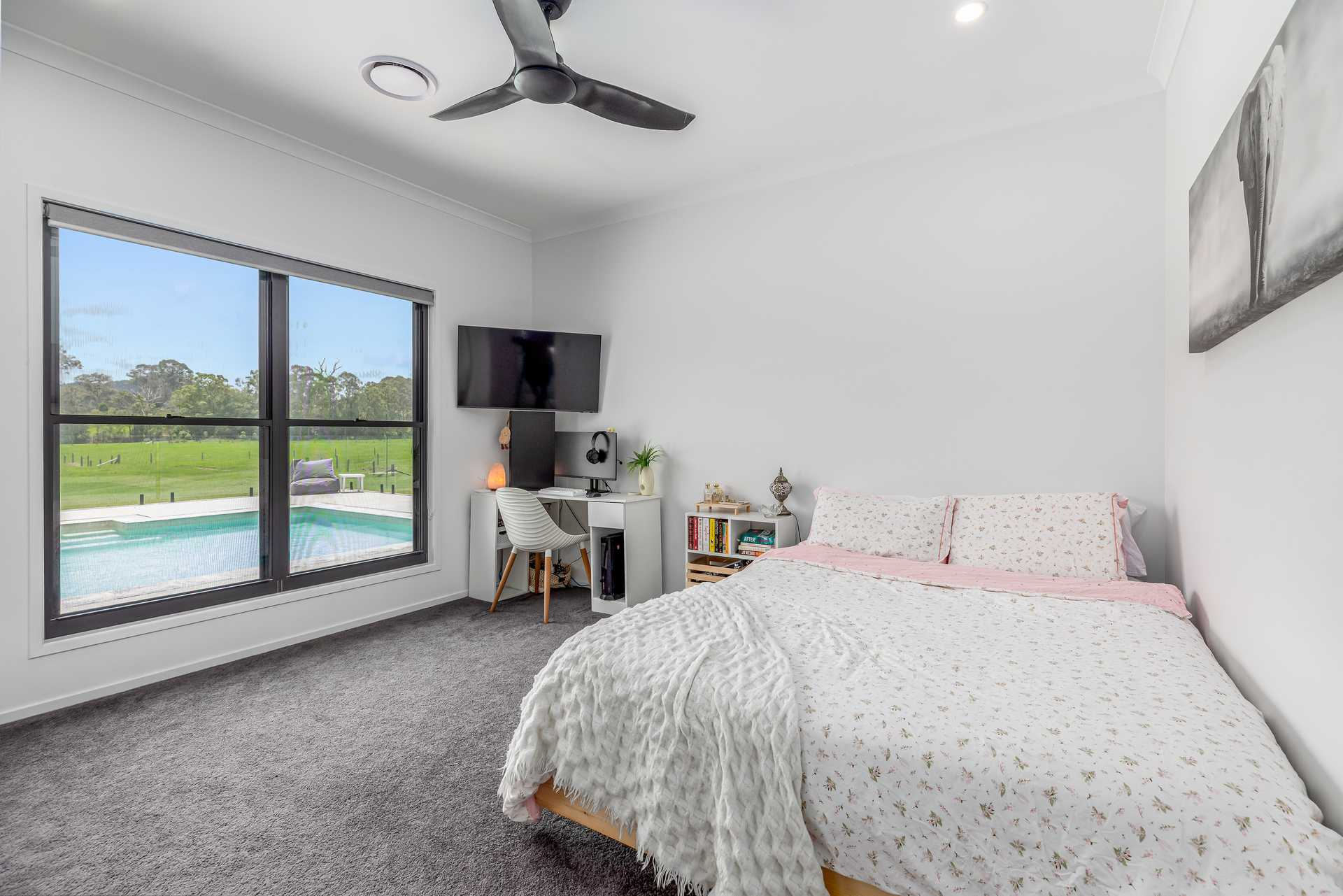 The remaining three bedrooms are privately positioned at the opposite end of the home, each with built-in wardrobes, deluxe carpets, ceiling fans and lovely outlooks – two of which enjoy views over the pool. A separate home office offers further flexibility to work from home or can be utilised as a fifth bedroom.
