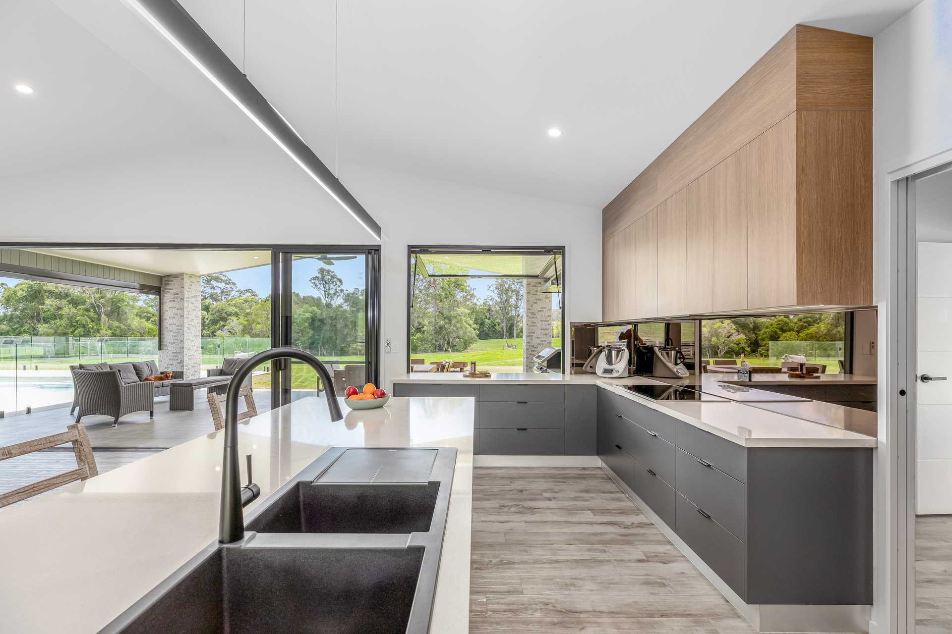 The heart of the home features soaring raked ceilings that enhance the feeling of space throughout the open-plan kitchen, dining and living areas.