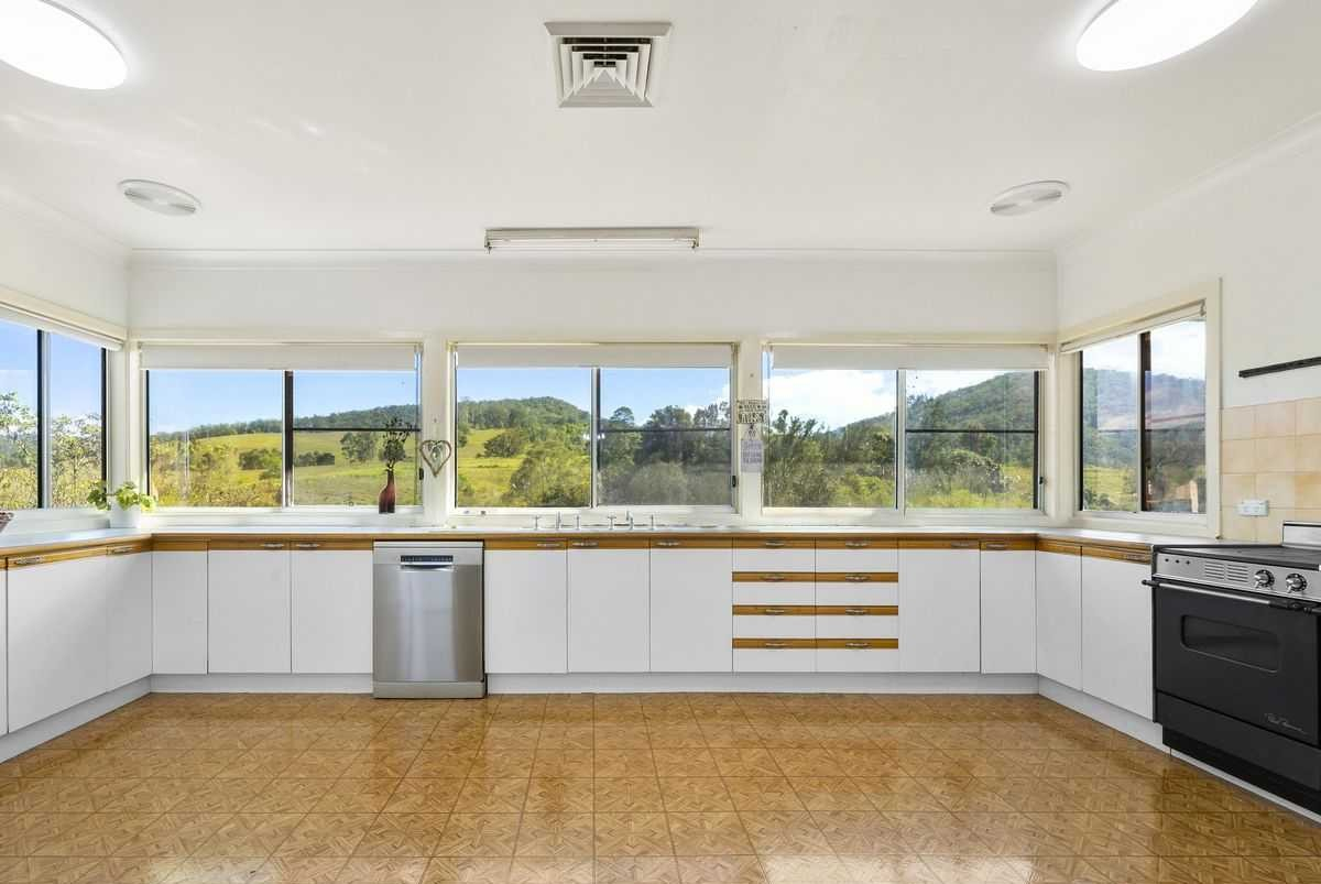 The home on this rural property for sale NSW features three living areas flowing through to a kitchen with river views