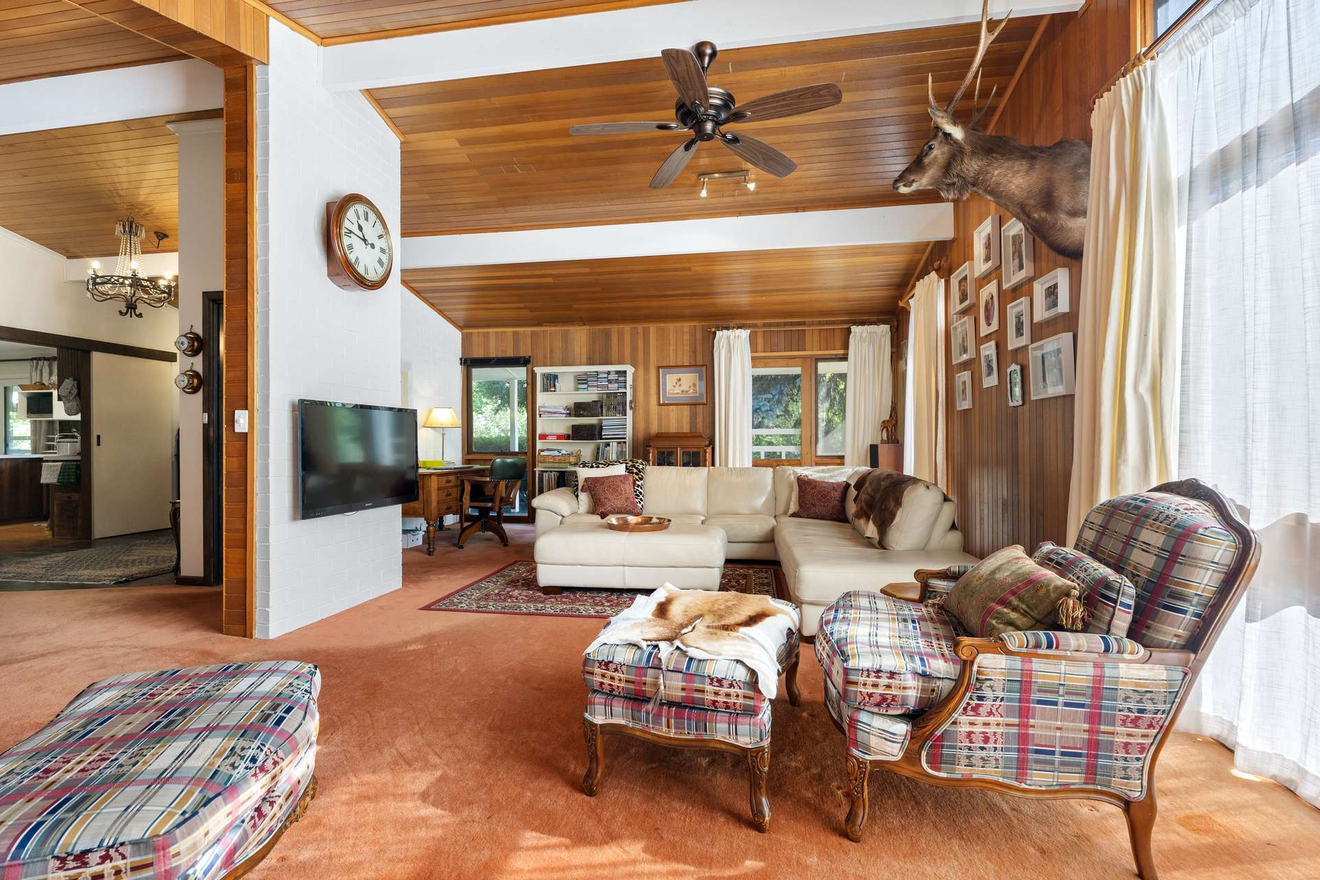 The home on this rural property for sale VIC features a cedar-lined living room and expansive windows capturing garden views
