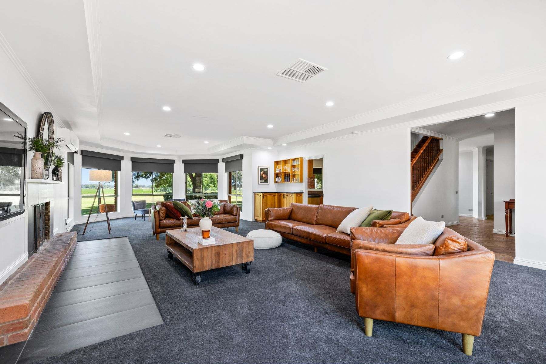 A grand staircase leads to a spacious living zone opening onto a stunning elevated deck with sweeping views across the irrigated pasture. This level also includes a large office and a superior master suite, offering an ideal sanctuary for work, rest and relaxation.