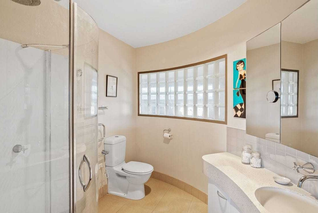 The home boasts three spacious bedrooms, including an upper-level master retreat with sound-proof glass door, curved entry, walk-in-wardrobe, ensuite, and private balcony with sweeping sea and mountain views. The two other bedrooms and a main bathroom with separate shower and spa bath, both located downstairs, cater for extended family and/or guests.