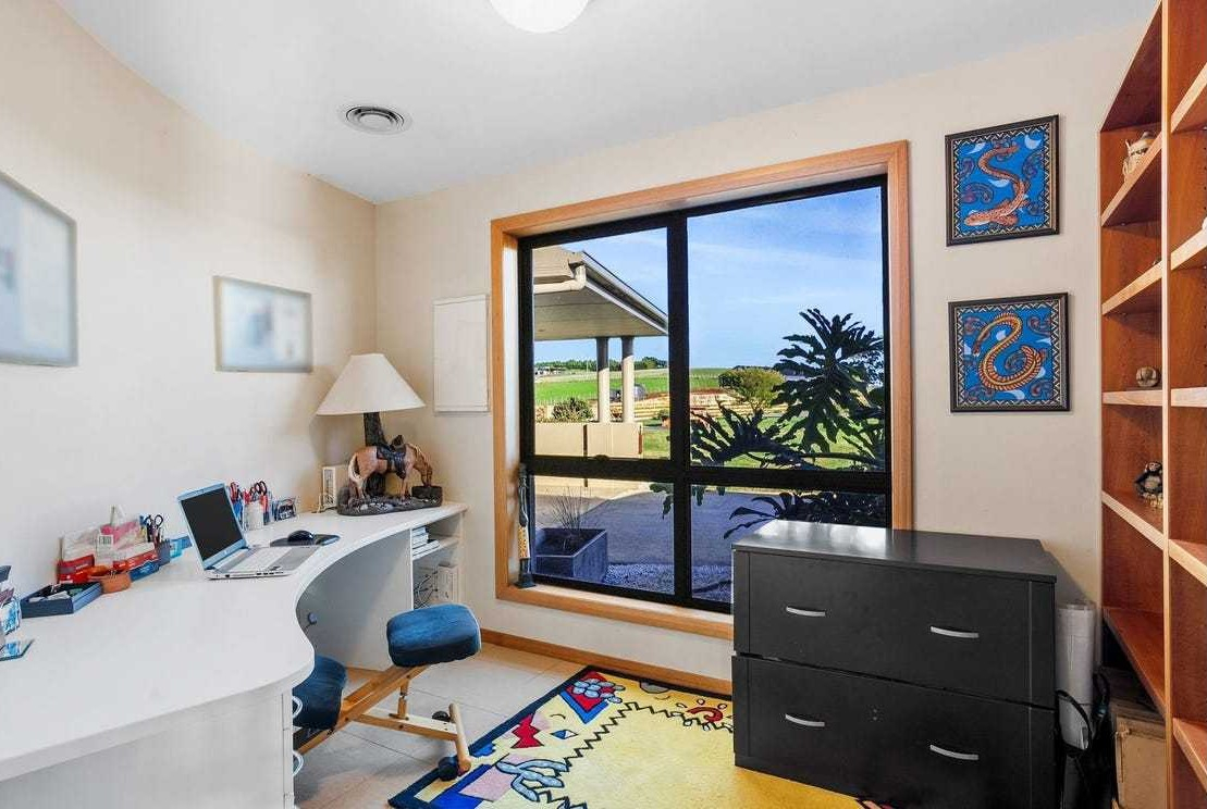 There are also a sunroom and second living area with full-width layout, Macrocarpa cathedral ceiling, King Billy Pine bar and curved Myrtle feature walls; and a functional home office with curved wall and bespoke floor-to-ceiling Myrtle bookcase and built-in desk.