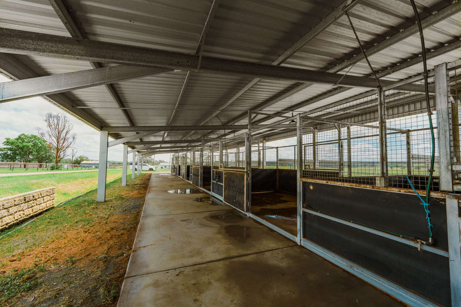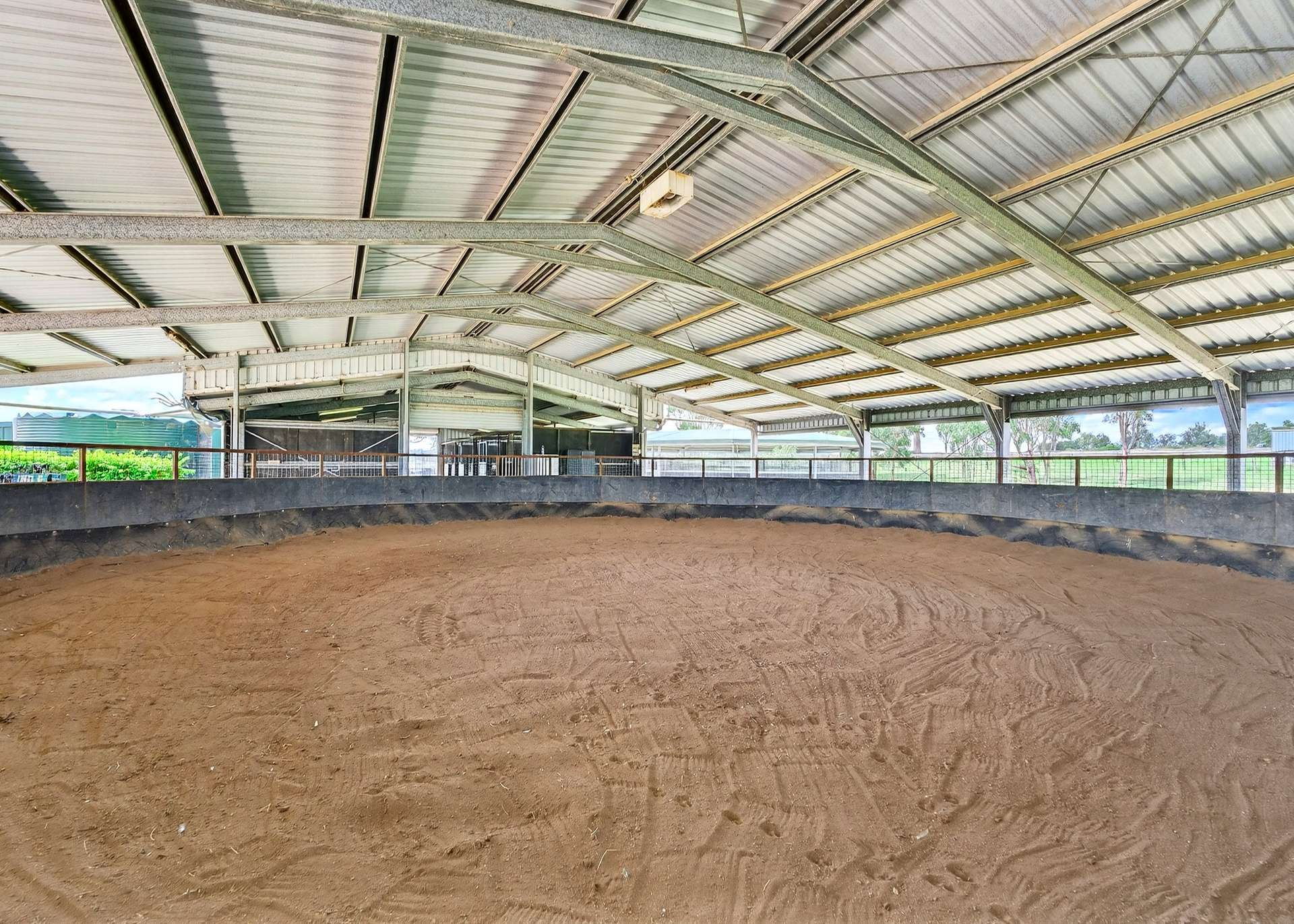The main stable barn incorporates 14 fully concreted boxes, wash bay and three tie-ups, internal 14-metre round yard under lights, hardstand surrounds and two powered storage sheds with rollers doors and concrete floors.