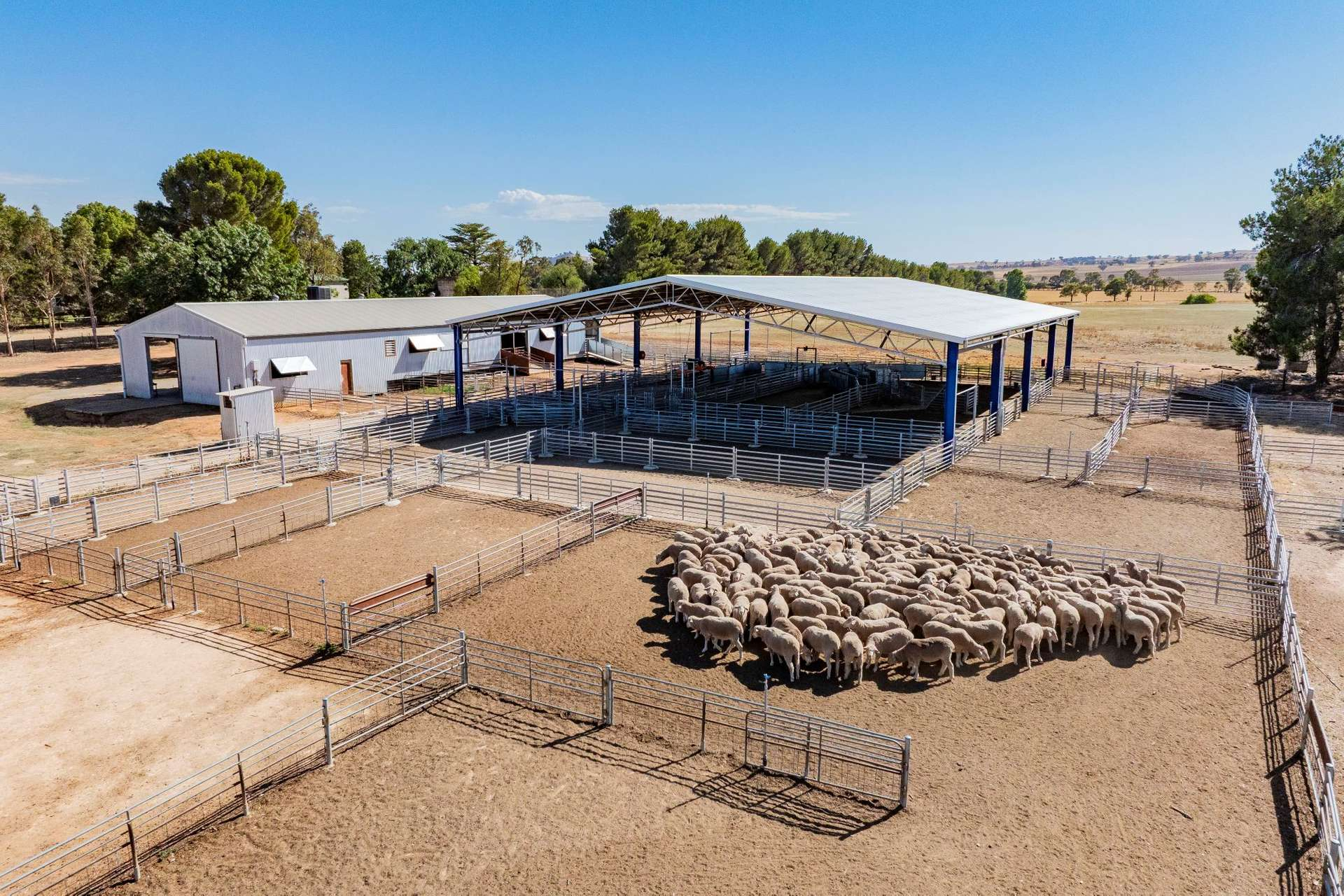 Additional improvements include a four-stand shearing shed with air-conditioning and electric overhead gear, fully enclosed machinery shed, multiple storage sheds, a hay shed, workshop, and 755 tonnes of elevated silo grain storage capacity.