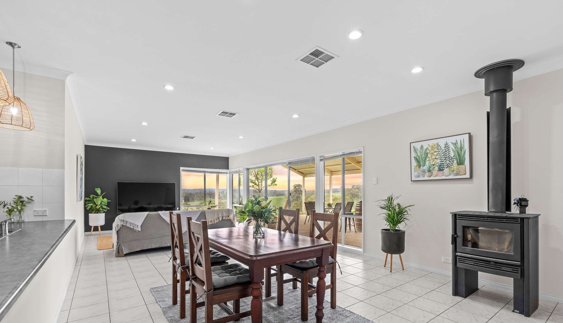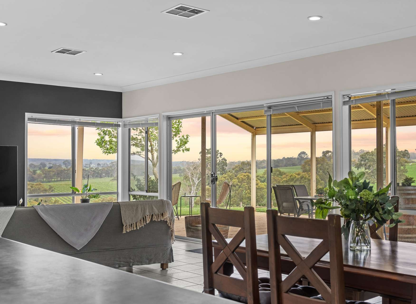 The home on this vineyard for sale SA offers a huge dining/lounge area with a slow-combustion log fire