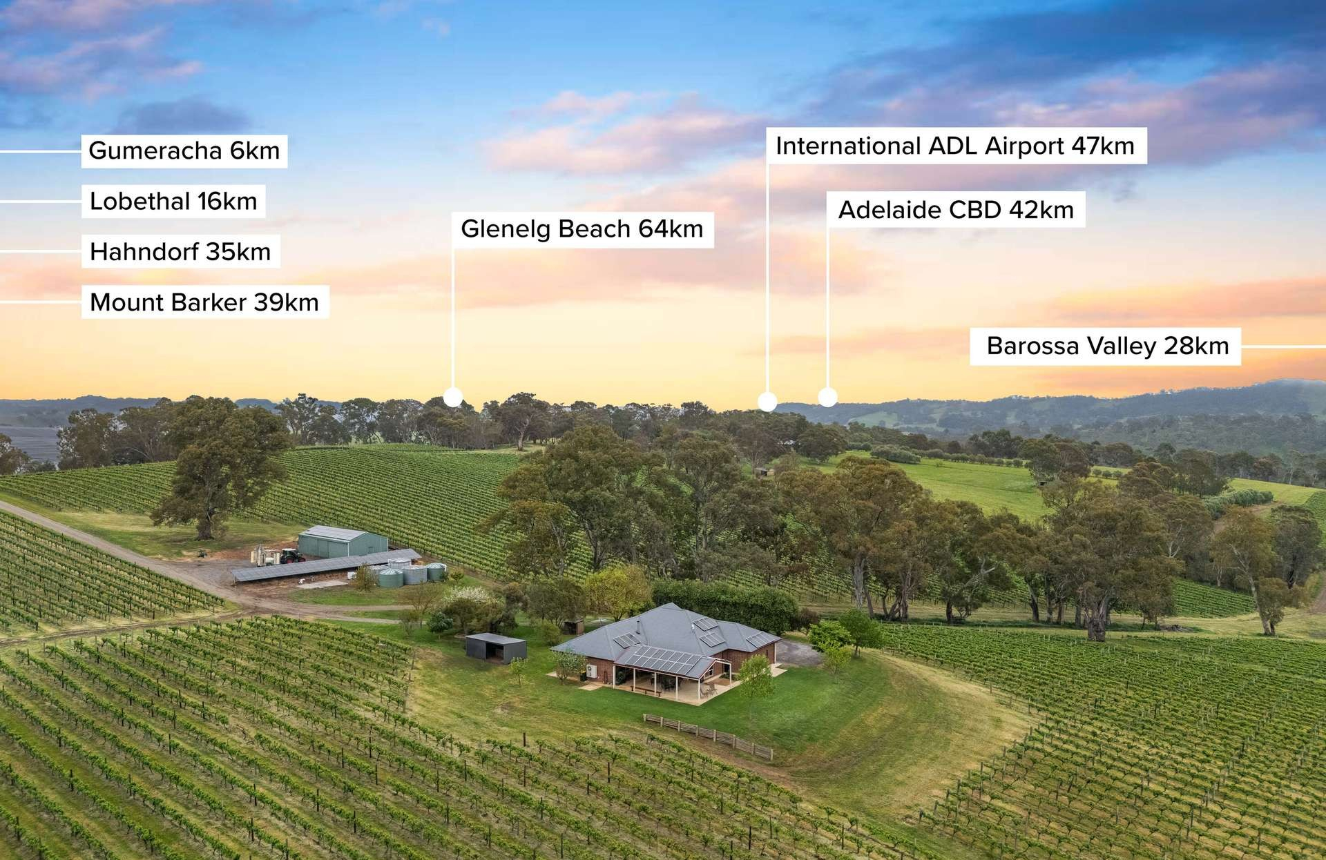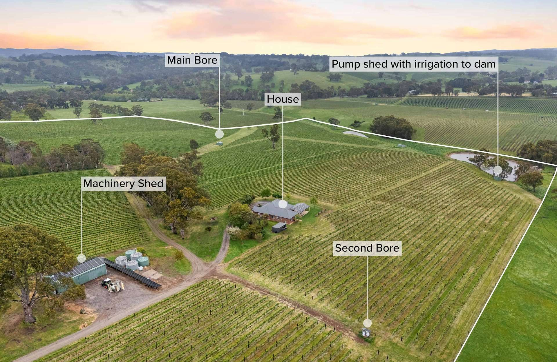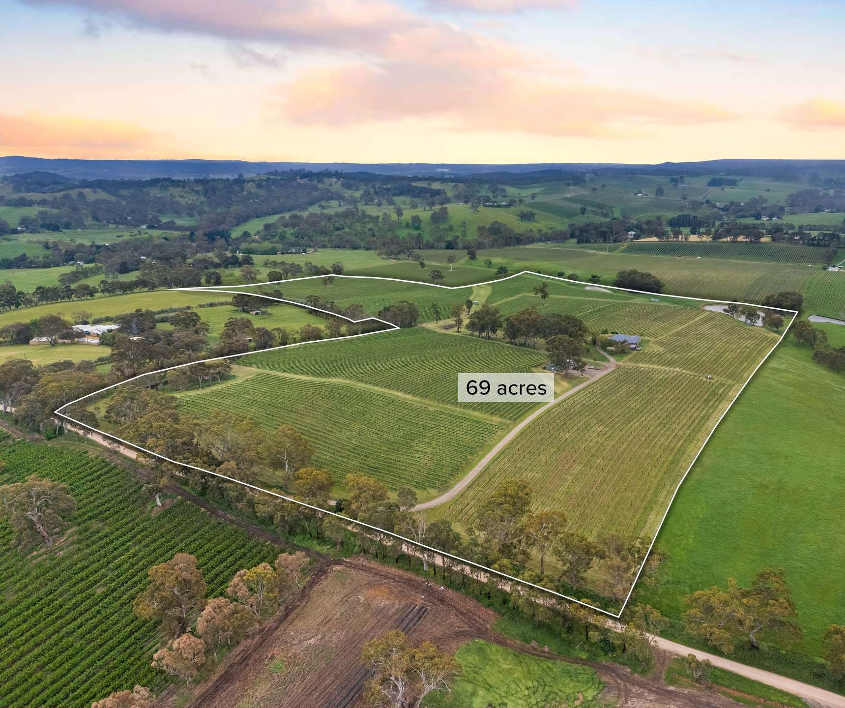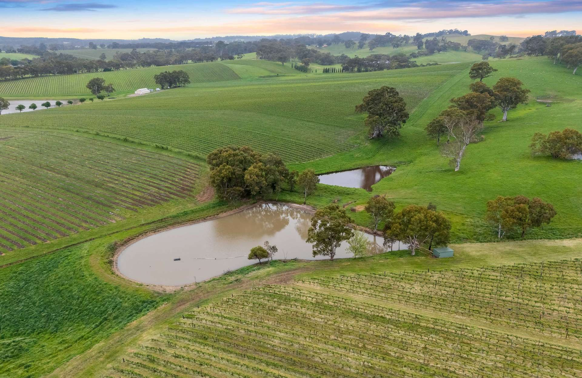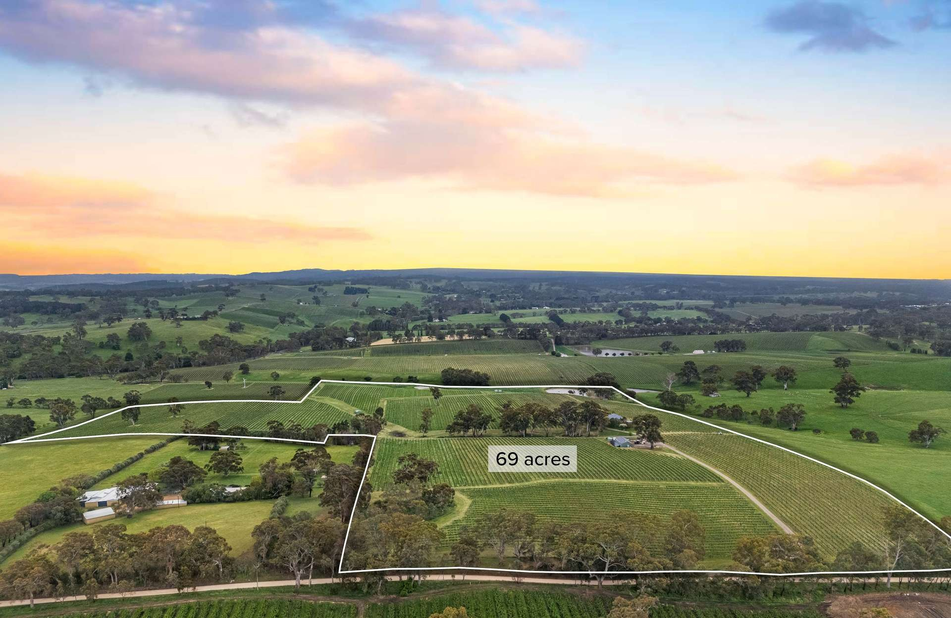An “excellent lifestyle property with income” located in South Australia’s premier Adelaide Hills region, ‘Bellwether Farm” comprises a total land area of 27.8 hectares (69 acres), with vineyards spread across 20.84 hectares (51.5 acres) planted to a variety of grapes.