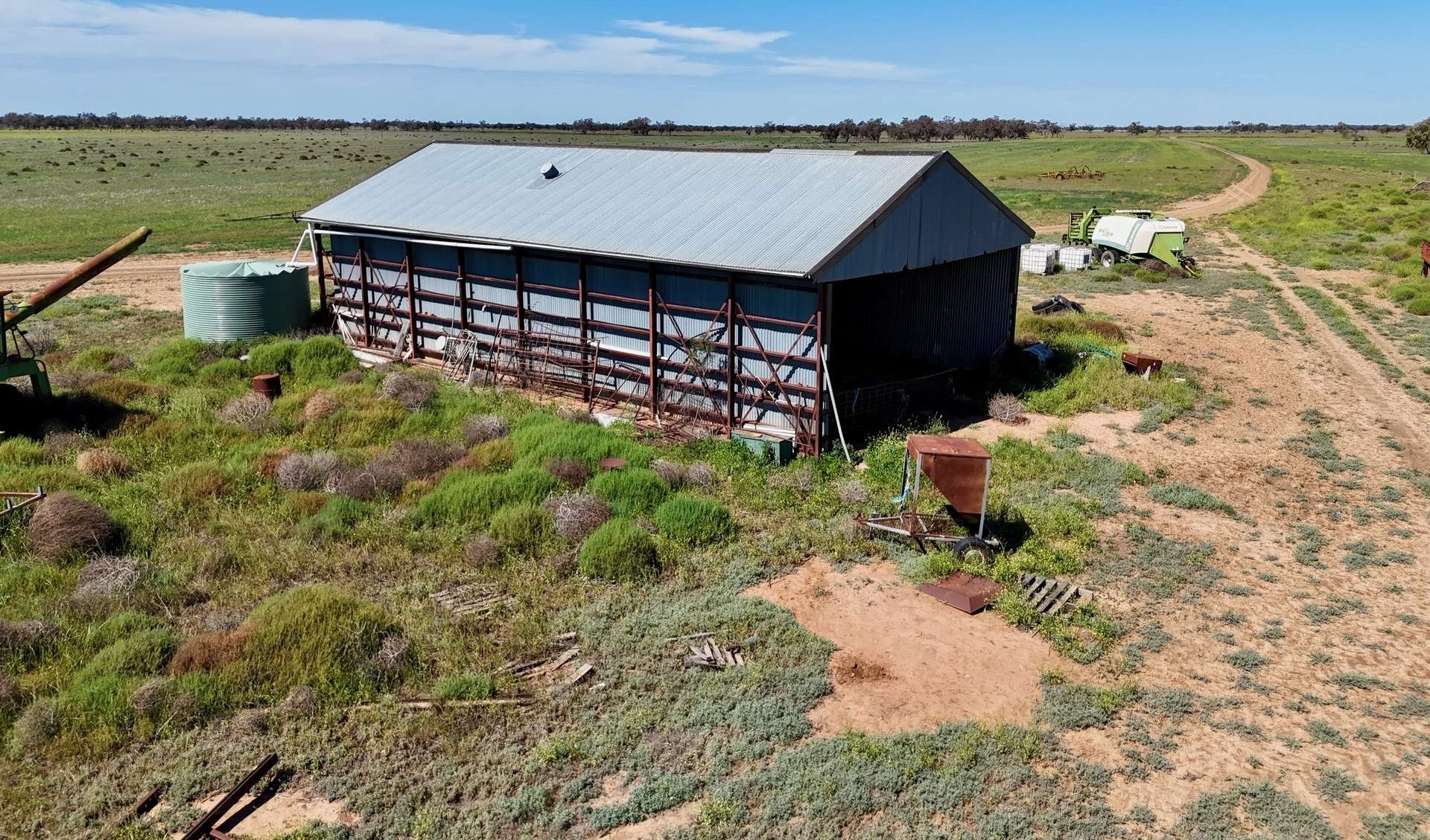 Additional infrastructure improvements include a machinery/grain shed with a storage capacity of 400 tonne, a small workshop in the curtilage, and basic sheep yards located adjacent to the old woolshed (derelict).